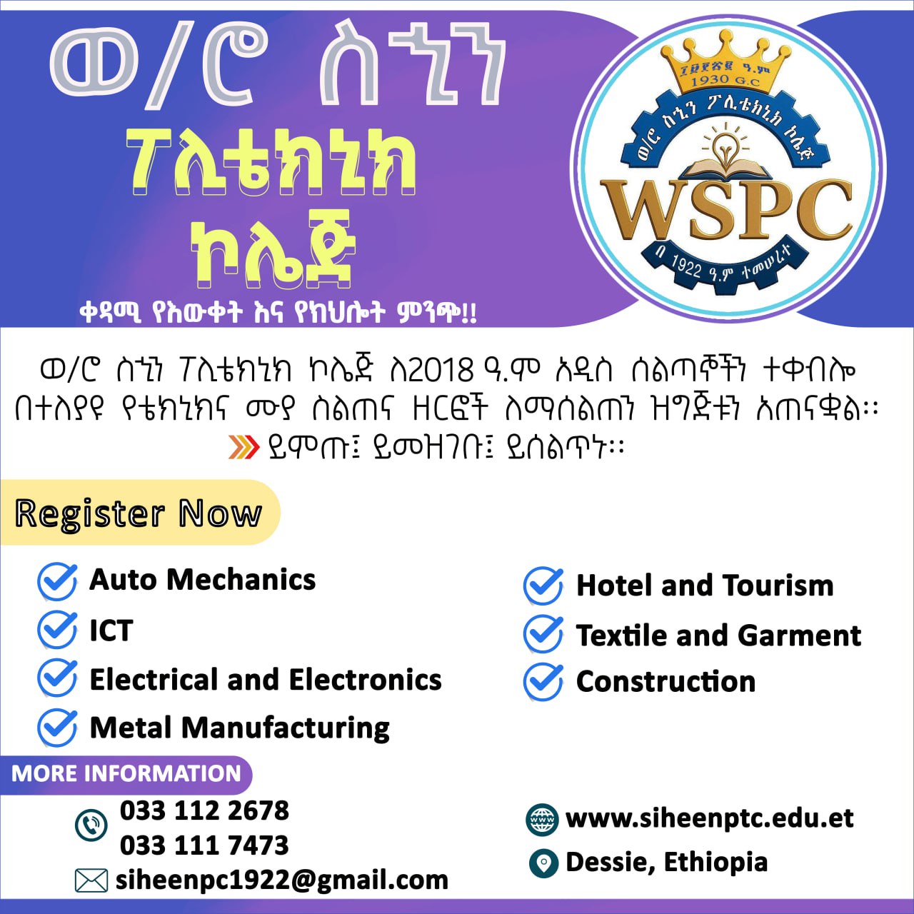 Back To Main Pageበሀገራችን ዘመናዊ ትምህርት ታሪክ ቀዳሚ የሆነው የወ/ሮ ስኂን ፖሊቴክኒክ ኮሌጅ እንኳን ለ2018 የትምህርት ዘመን በሰላም አደረሳችሁ ይላል፡፡ ኮሌጃችን በ2017ዓ.ም በዓለም አቀፍ የጥራት ሥራ አመራር ሥርዓት ISO 9001:2015ን ተግባራዊ በማድረጉ ከኢትዮጵያ የተስማሚነት ምዘና ድርጅት የጥራት ሥራ አመራር ሥርአት ሰርተፊኬት ማግኘቱን ስንገልፅ በታላቅ ደስታ ነው፡፡ በርካቶች ሰልጥነው የሙያ ክህሎት ባለቤት የሆኑበት ኮሌጃችን በተለያዩ የስልጠና አይነቶች፣ብቃት ባላቸው አሰልጣኝ መምህራን ፣በተለያዩ ቴክኖሎጂዎች በተደራጁ ወርክሾፖችና የኢንተርኔት አገልግሎት ያላቸው ቤተመፃሃፍቶችን በማደራጀት እያሰለጠነ ይገኛል፡፡ ዘንድሮም በ7 የስልጠና ዘርፎች አዳዲስ ሰልጣኞችን ከደረጃ1-5 በቀንና በማታ መርሃ-ግብር ለማሰልጠን ዝግጅቱን አጠናቆ ምዝገባ ጀምሯል፡፡ እርስዎ ባሉት የሙያ ዘርፎች ሰልጥነው ራስዎን፣ቤተሰብዎንና ሀገርዎን መጥቀም ከፈለጉ ያለምንም ጥርጥር ቀዳሚ ምርጫዎ ወ/ሮ ስኂን ፖሊቴክኒክ ኮሌጅን ያድርጉ!